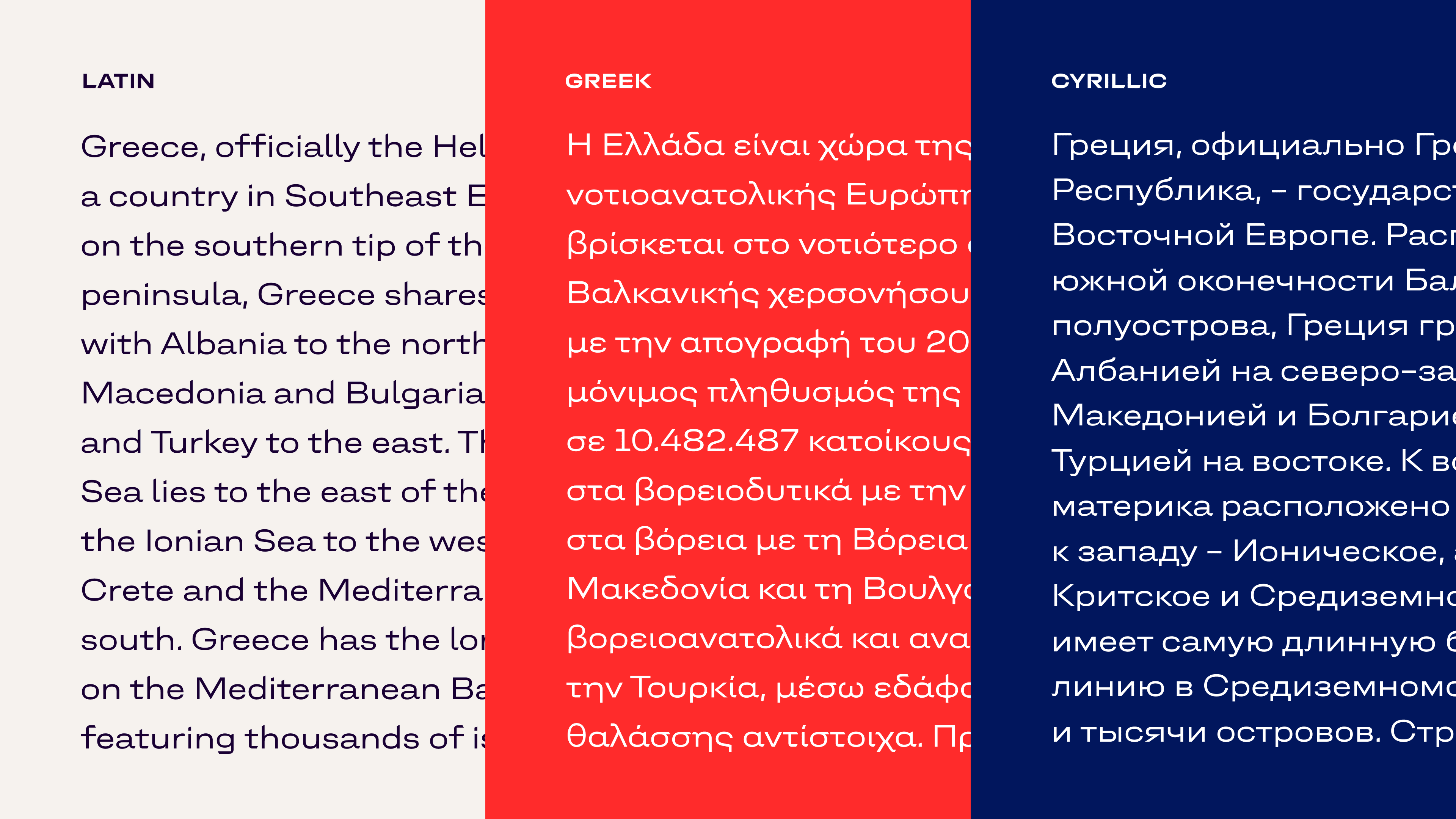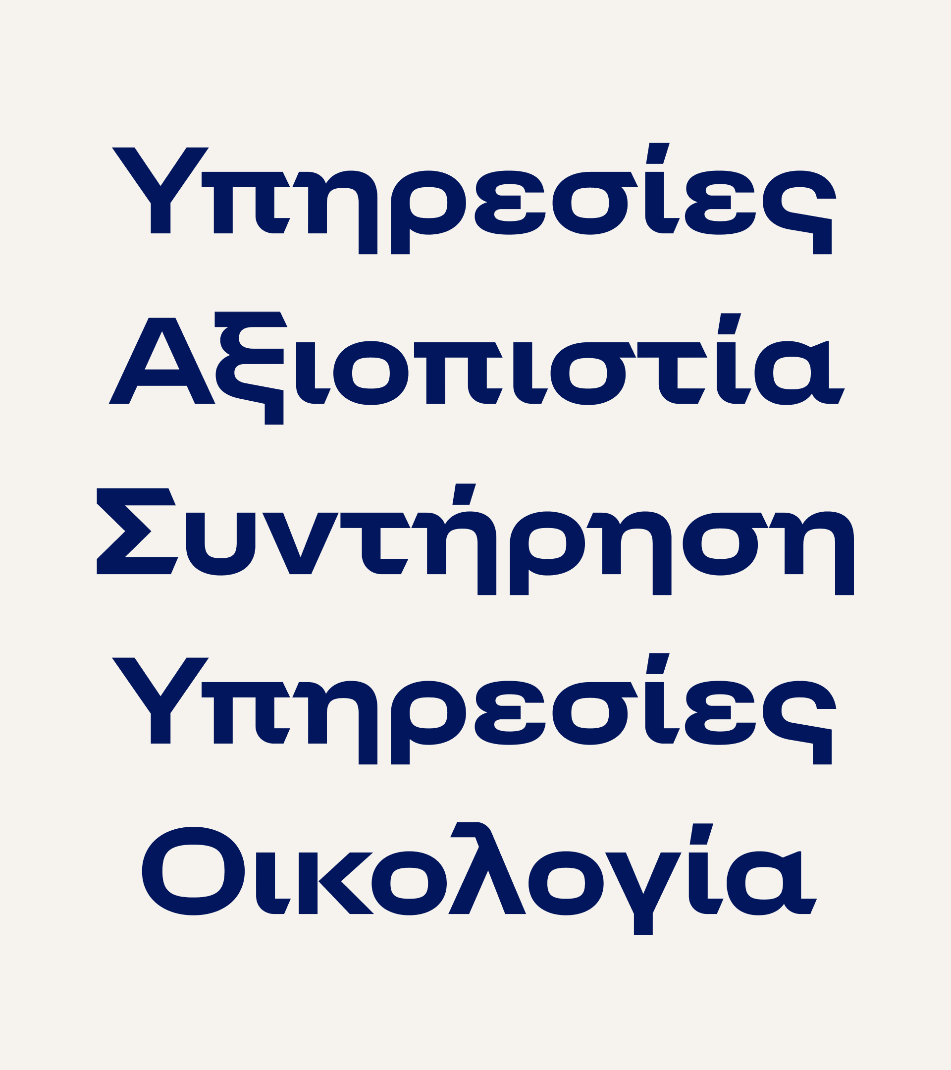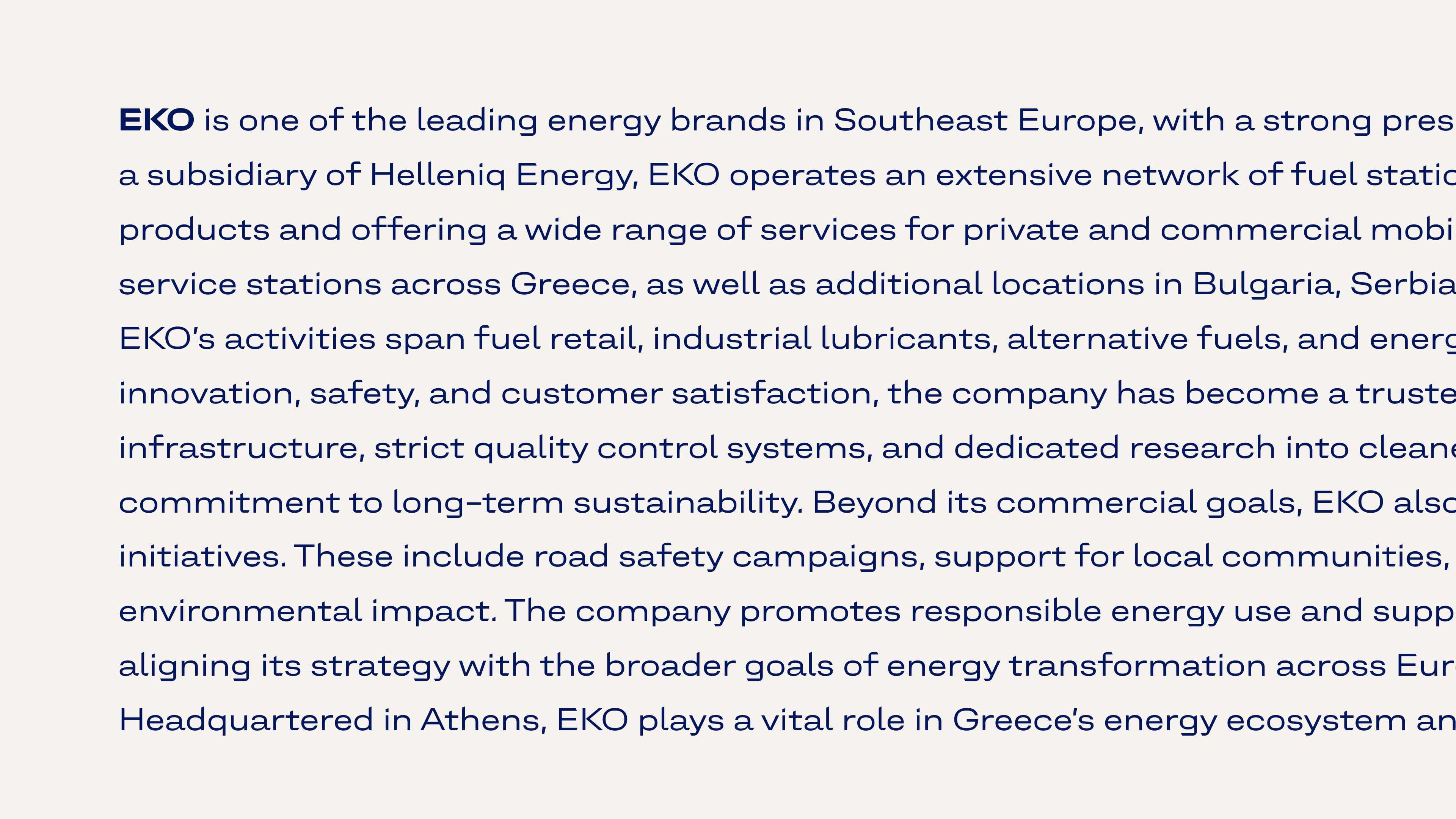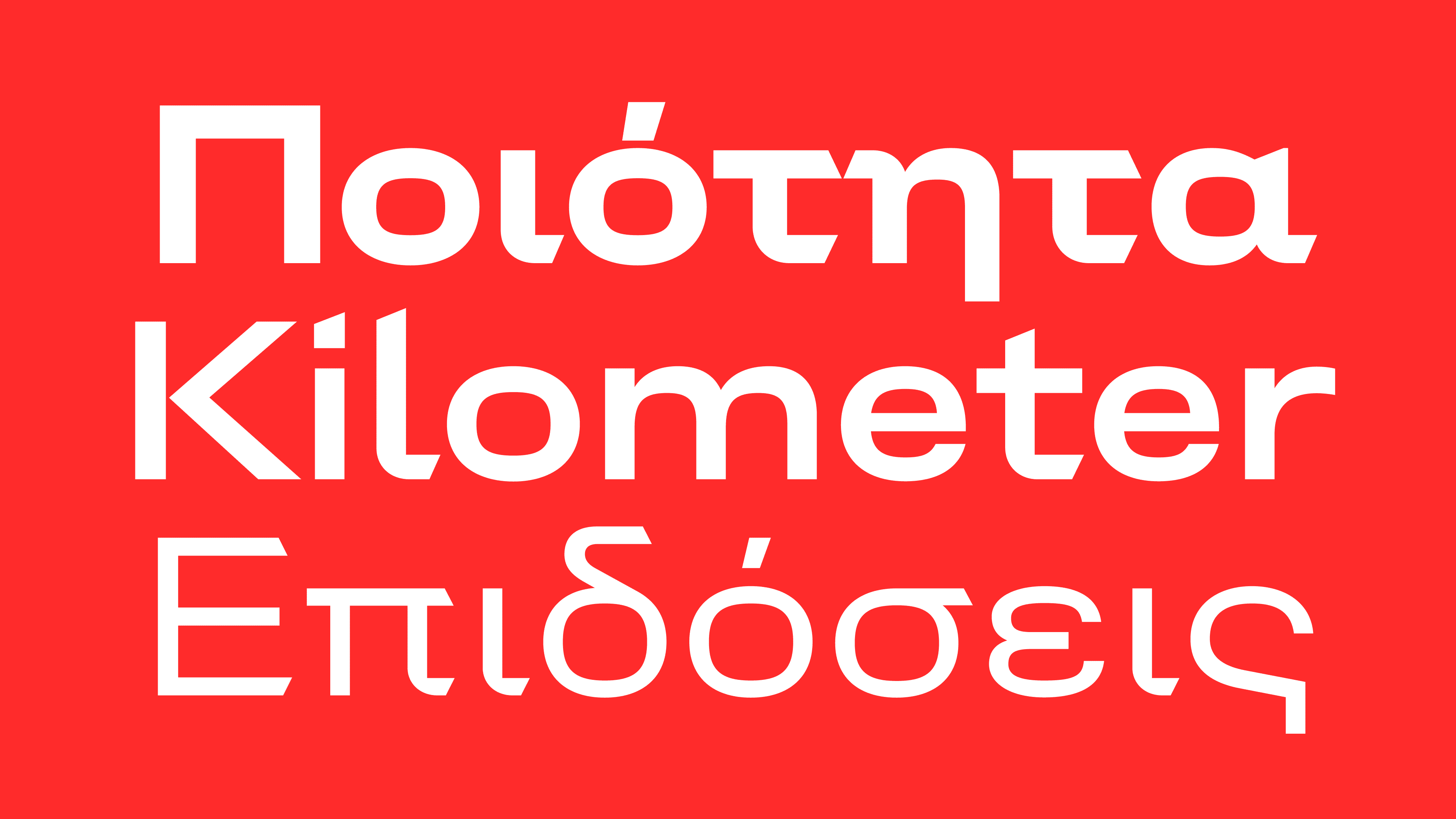 Since EKO primarily operates in Greek- and Cyrillic-speaking regions, the typeface family was developed in three scripts—Greek, Cyrillic, and Latin—to ensure consistent brand communication across all markets.