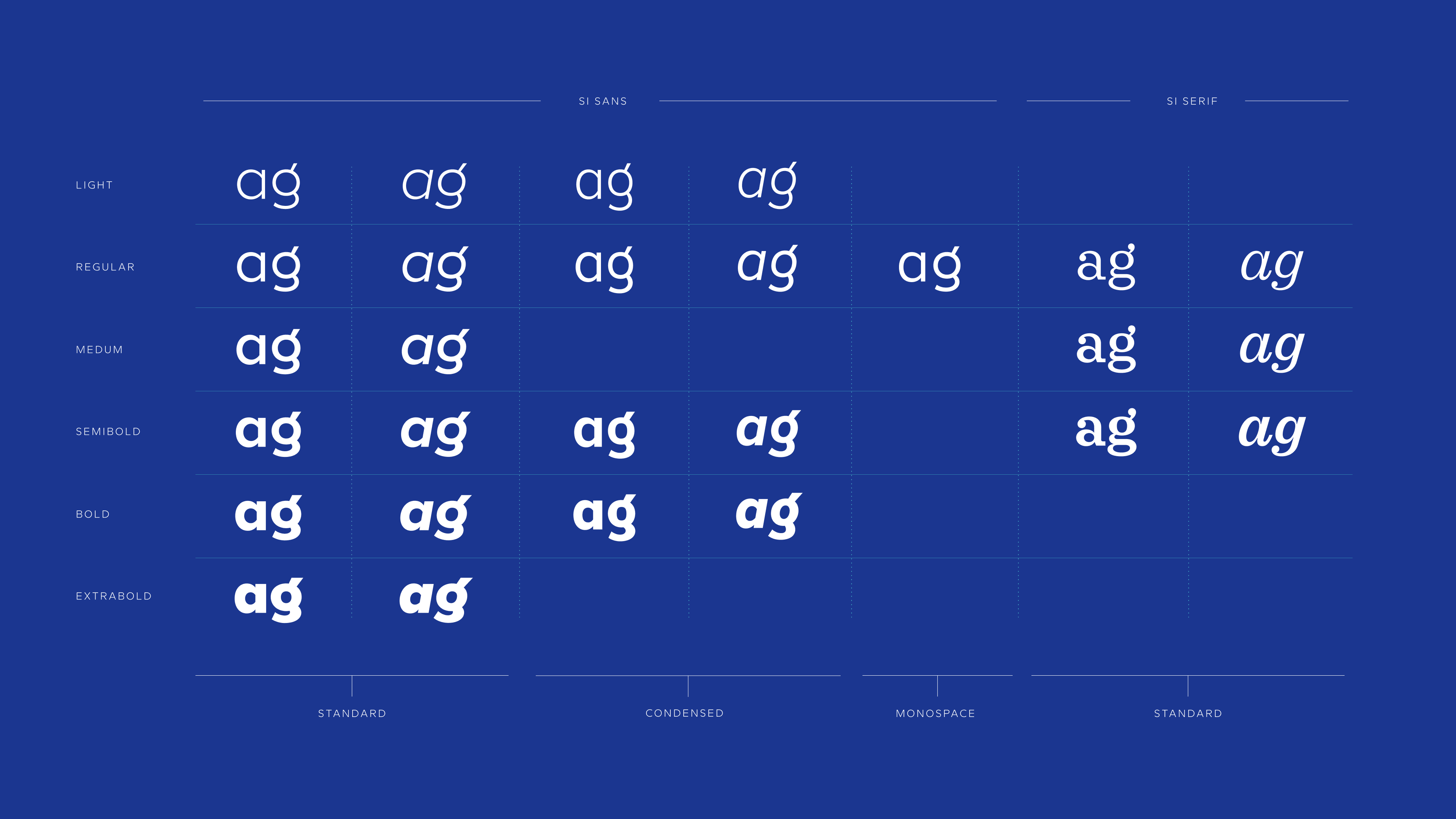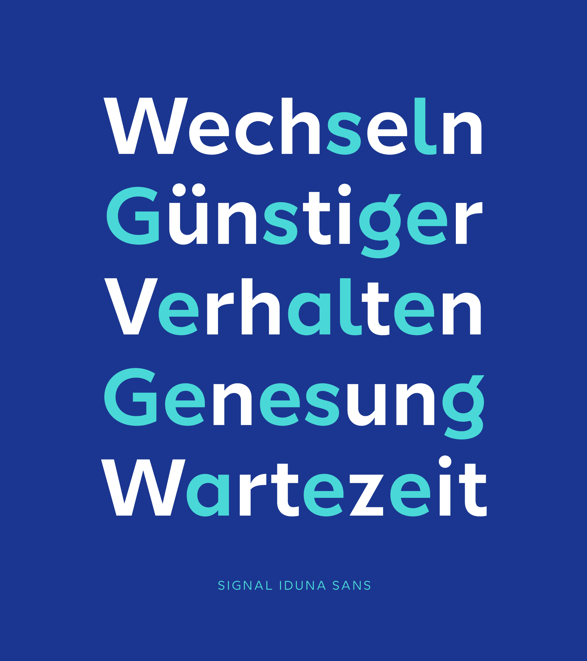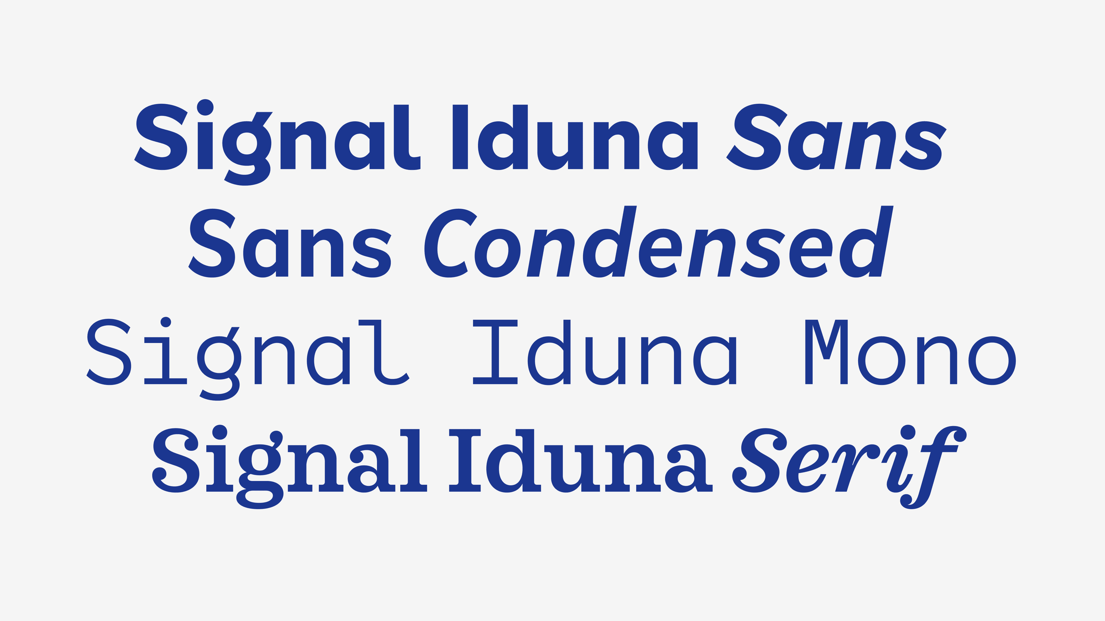 The serif typeface acts as a complementary counterpart to the clean sans serif, adding warmth and distinction to the system. To further extend its range, two condensed weights and a monospaced style were developed, enhancing the functional scope of the sans serif family. In total, the Signal Iduna typeface system comprises 21 styles, providing the flexibility required for a wide spectrum of typographic applications.